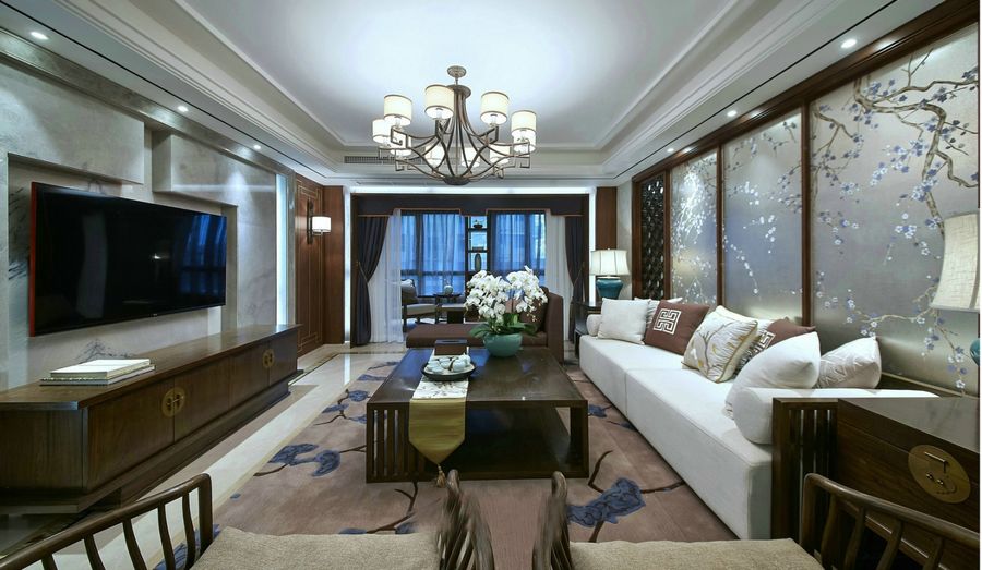 4.在新中式客厅装修过程中,其造型一定要遵循简洁硬朗和对称的这一原则。层次感,中式客厅装修的家居很讲究层次感,不同的空间会有不同的效果,会利用一些屏障或屏风等隔断来设计出层次感。色彩沉稳,中式客厅装修在色彩上大多采用庄严沉稳的颜色。