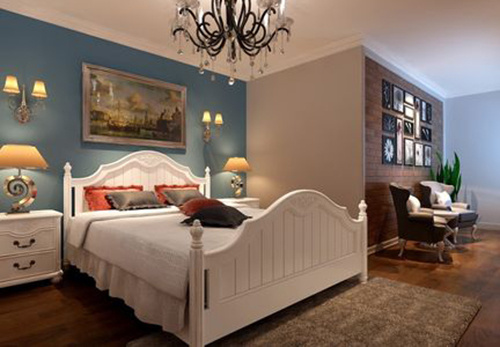 卧室,床头背景墙挂上壁灯,并在房间中央用吊灯营造气氛,让人置身其中,舒适、温馨的感觉袭人,让那些为生活奔波的人找到了归宿。