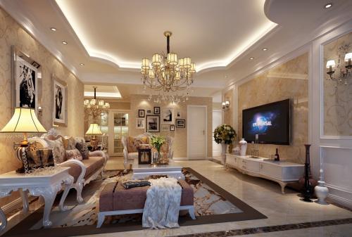 欧式客餐厅顶部用大型灯池,并用华丽的吊灯营造气氛。背景墙顶部做成弧形,再加上壁灯造型。墙面用绿色环保的蓝天豚硅藻泥,以衬托豪华效果。欧式客厅用家具和软装饰来营造整体效果,深色的烤漆实木家具,都是本案欧式客餐厅里的主角。还有浪漫的罗马帘,精美的油画,都是点染欧式风格不可缺少的元素。客厅的大部分在挑空结构之下,大面积的玻璃窗带来了良好的采光,落地的窗帘很是气派。壁灯自然不可或缺,它被安置背景墙左右两边,又与半弧形的背景墙相呼应,给敞开式的客厅提供了一个新的亮点。