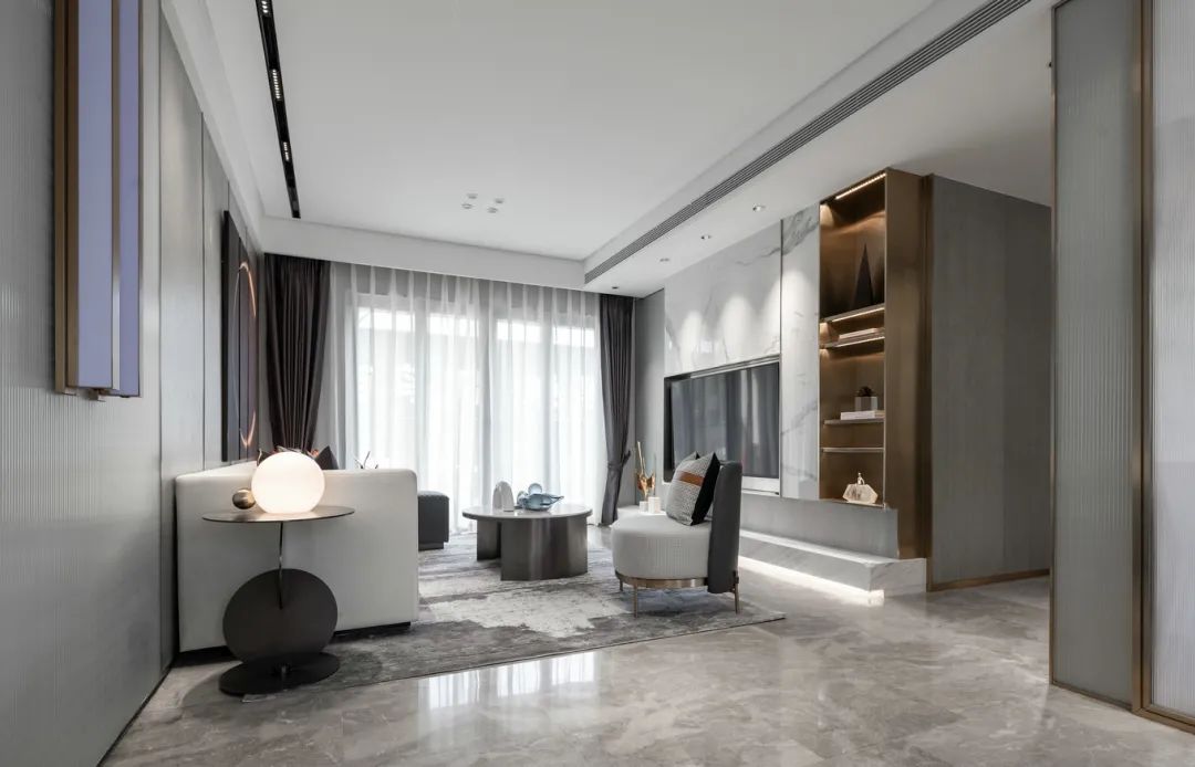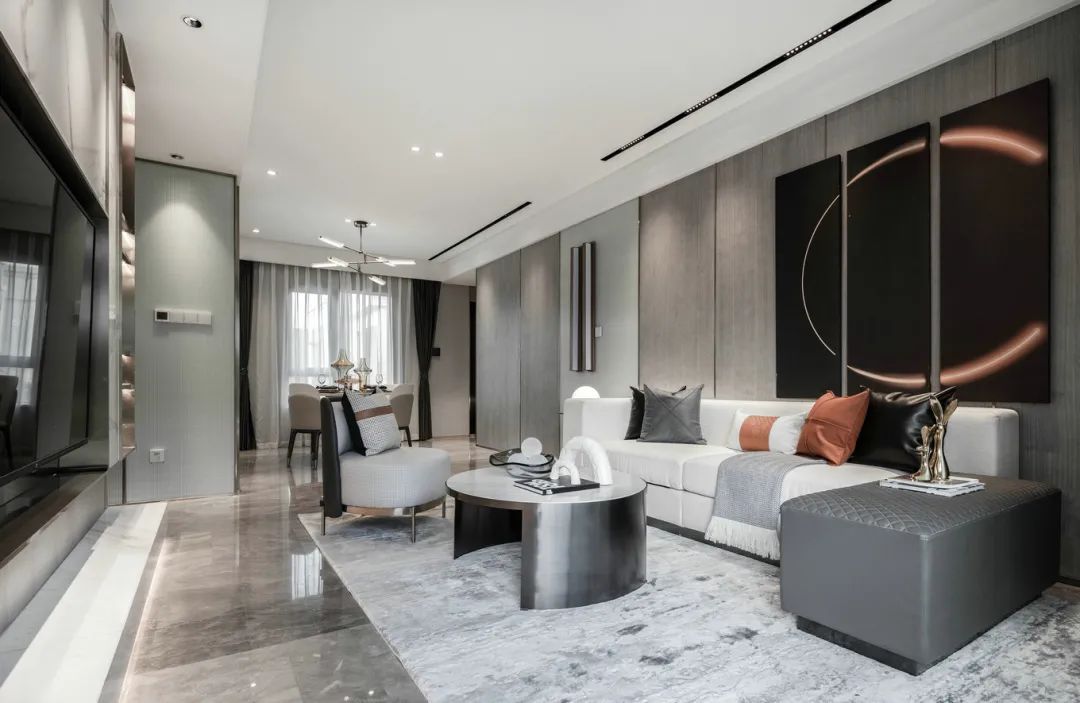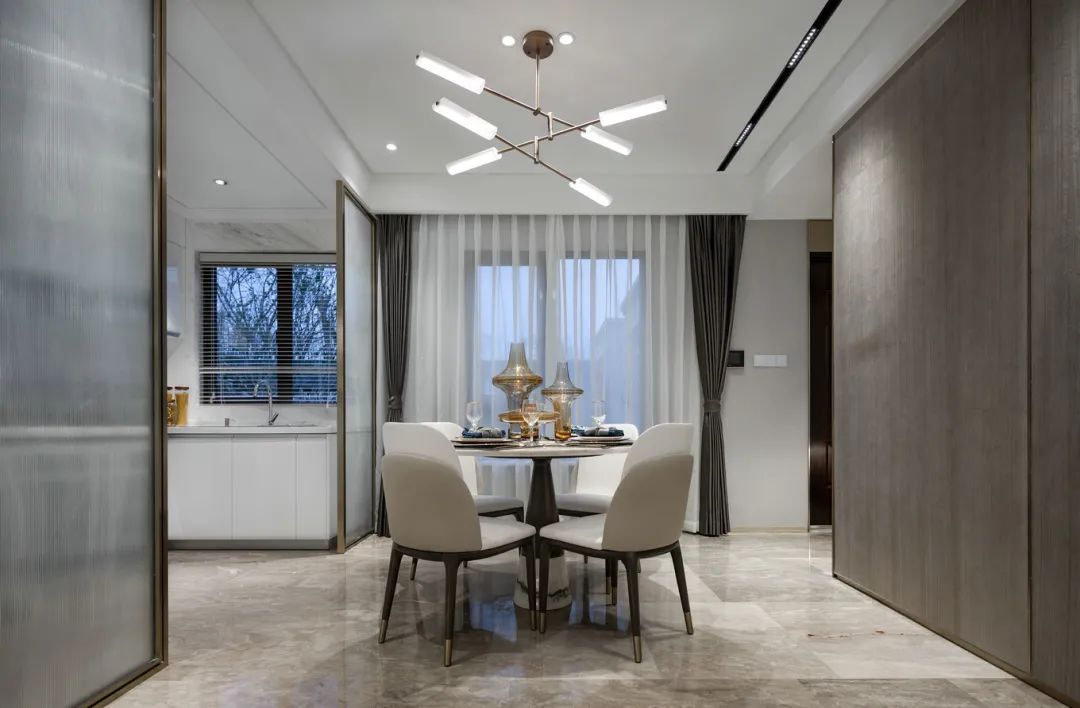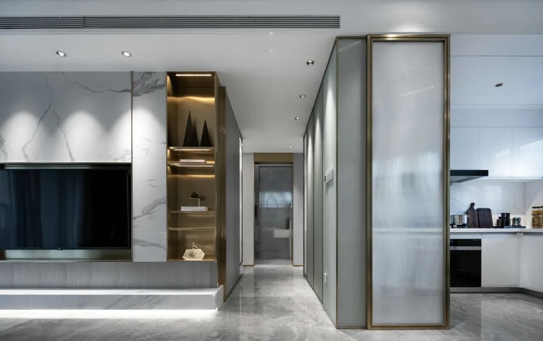 ▲现代风的质感与设计,贯穿着过道与客餐厅区域,金属与石材质感的加入,让空间显得格外的优雅高级。