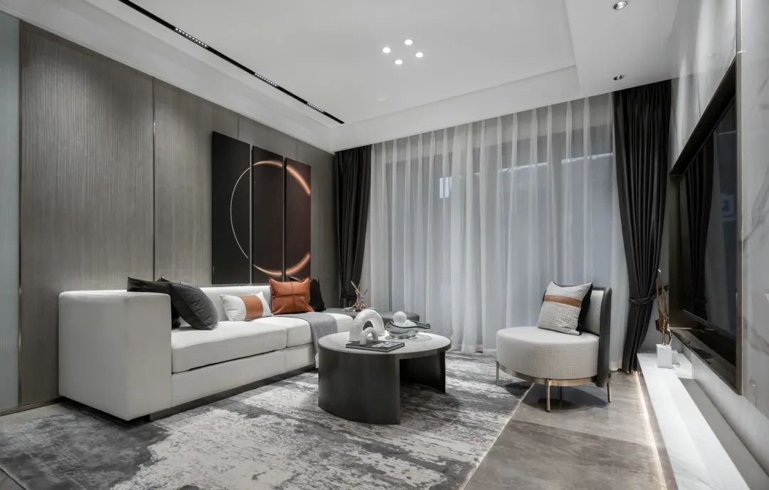 ▲沙发墙以木饰面的背景基础,挂着一组黑色的装饰画,画面内容是月食图案,也让空间显得更加神秘优雅。