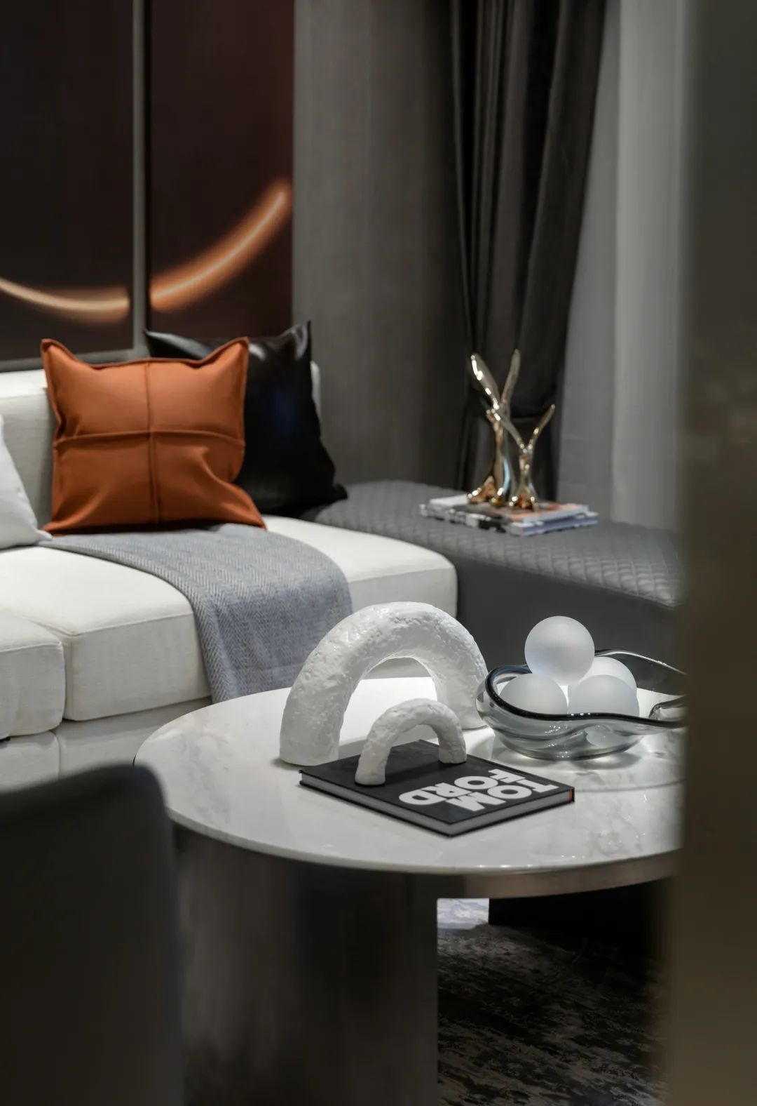 ▲现代艺术感满满的细节摆饰,布置在简洁明亮的客厅里,营造出一种淡雅舒适的舒适体验。
