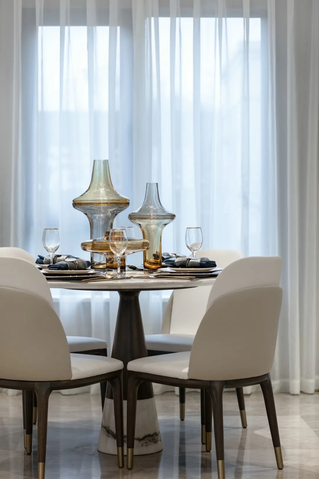 ▲餐桌上精致的餐具与玻璃器皿布置,也使得用餐氛围更加优雅华丽。