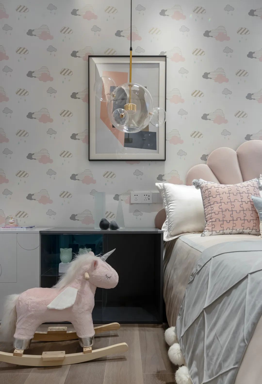 ▲儿童房的床头墙加入可爱的云团图案壁纸,布置皮艺床,床尾一块圆形地毯,摆上一个粉色小木马,让儿童房充满可爱的童趣感。