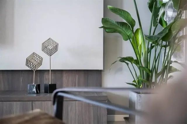 电视柜旁摆芭蕉叶的绿植来过渡客餐厅的空间。让客厅充满生机!