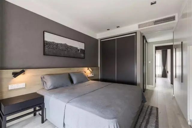 主卧床头墙贴深灰壁纸,再挂一幅灰白调的装饰画,