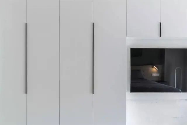 床尾做了整墙的白柜,而壁挂电视嵌入一层、既可以收纳
