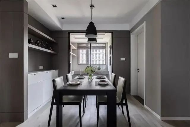 灰色的墙面氛围下,搭配搁板+白色斗柜的餐边柜,