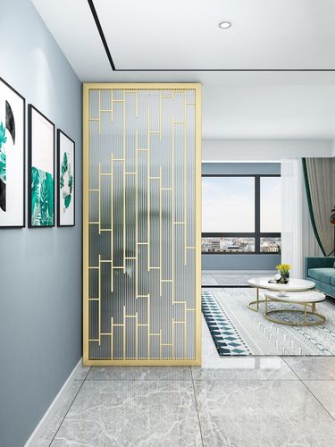 2、工艺玻璃材质,时尚,施工简单,能够营造出温馨的氛围。框架玻璃隔断,采用木框、铝合金、不锈钢做框架,框架里面嵌玻璃。此种隔断的特点是富丽堂皇,适用于比较大的客厅。