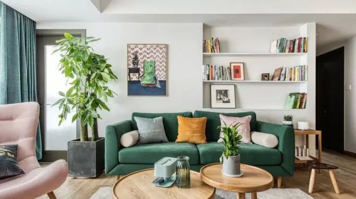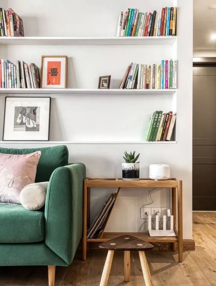 ▲客厅的沙发墙留出半边空间安置了一个嵌入式书架。放置几本书籍、相框和小摆件更显得沙发墙文艺清新。