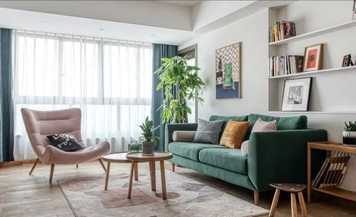 ▲沙发和旁边的绿植以及窗帘保持了同色系设计,绿色提亮了整个空间。粉色单人椅年轻水嫩,增添了一丝俏皮可爱。家具采用原木材料描绘出温馨自然的氛围。