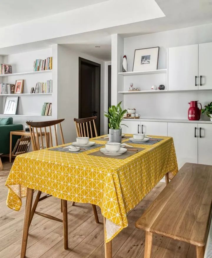 ▲餐厅选用原木质感的餐桌椅,长条凳搭配双把椅的混合搭配是专属于年轻人的选择。明黄色的桌布富有情调,是餐厅点睛之笔。
