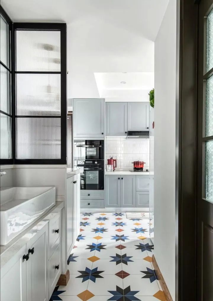▲厨房地砖和入户玄关采用的是同一种瓷砖,搭配清新色调的灰蓝色橱柜和同款风格的可爱地垫,让厨房空间充满了年轻时尚感。