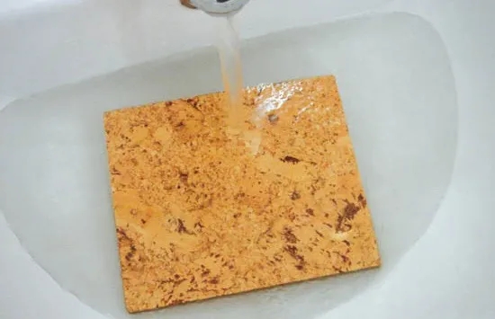 4. 胶合强度检验,将小块样品放入开水中,发现其砂光的光滑表面变成癞蛤蟆皮一样,表面凹凸不平,则此产品为不合格品,优质品遇开水表面无明显变化。