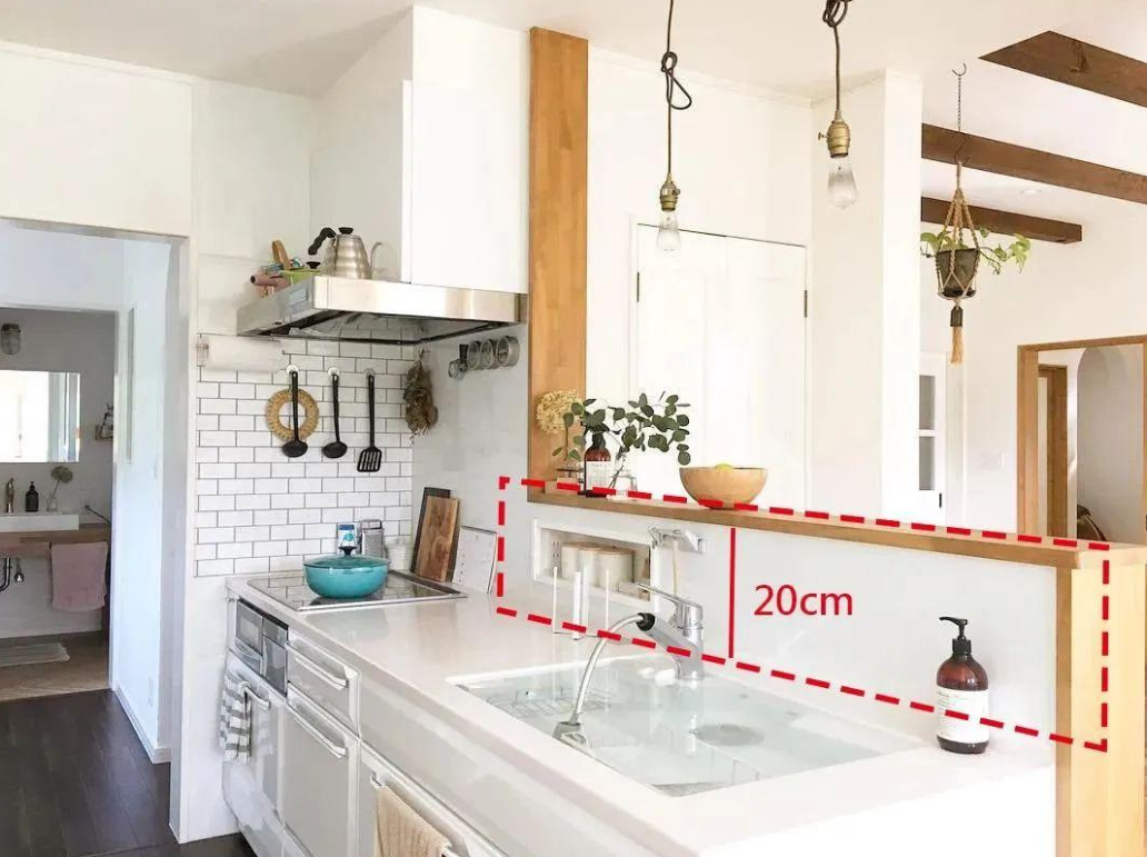 这个更多是针对开放式厨房的,抬高的20cm“隔断”,墙面做凹槽收纳,台面可以作为吧台,而整体的话,可以形成一个隔断,可以说是实用性非常高。