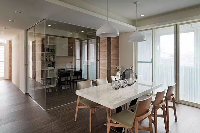 白色大理石餐桌面、木质餐桌,白色吊灯,再搭配黑色的造型摆件,餐厅配色采用经典的黑白搭,而且也跟客厅配色一直,空间整体感很好。