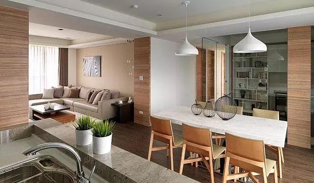 以前看过的现代风比较普通,而这次的设计不一样,多以木饰面和卡其色为主,虽然也简单,但是布局通透,简约干练。