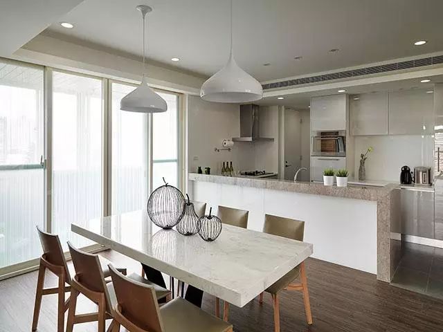 厨房水盆紧挨着餐桌椅,这样的开放式厨房,时尚又美观。