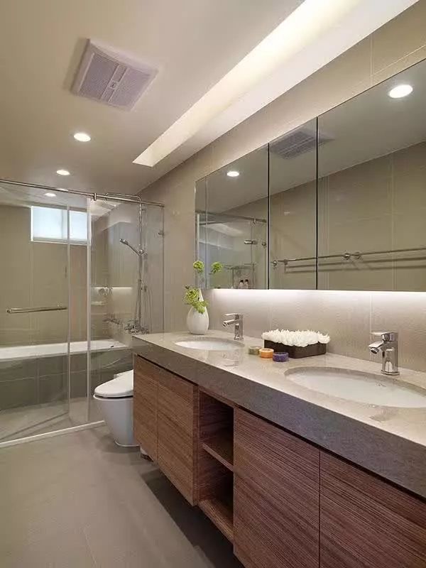 卫生间使用玻璃和镜子,使得整个空间看起来宽敞、简洁。