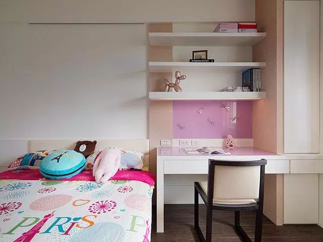 这是女孩房,主配色为粉红系,空间虽然不大,只有一张小床,一张书桌架,不过整个氛围却温馨、舒适。