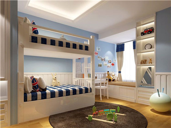 “上下铺”这种设计,可以说是小户型的最佳设计了。年龄稍大的孩子睡上铺,小的睡下铺。然后,再安排两张小书桌或者是规划成游戏区,这样的儿童房设计也是非常不错的。