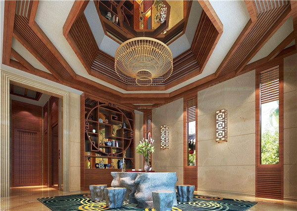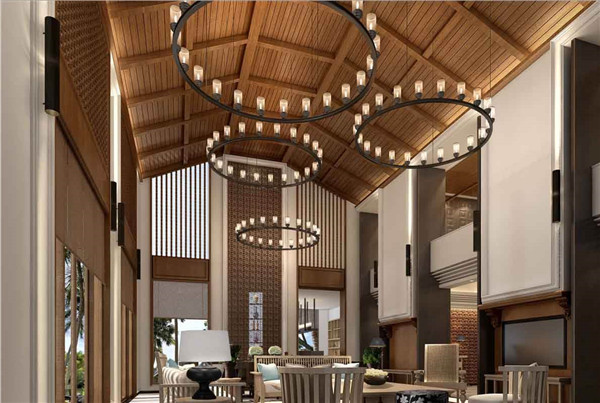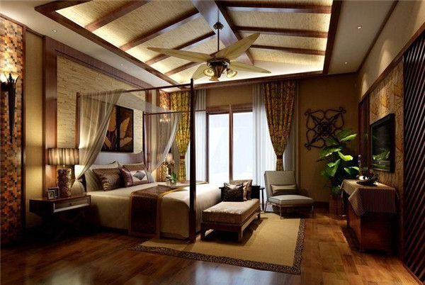 在东南亚风格酒店装修设计中通常顶面都会有安装通风管道、消防管道、音响设备、照明灯具、电源线路等多种设备,吊顶的设计也是与整个装修风格相协调的,色彩和艺术造型同样具有着浓厚的东南亚热带雨林的风格,或者是带有宗教风格的艺术绘画。