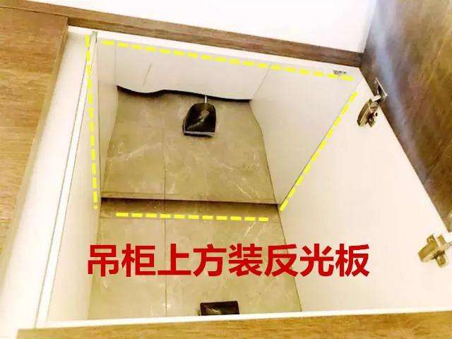 3. 吊柜顶部安装一个反光板,尤其是在装修的时候可以使用在一些高处的顶柜上面,顶部的柜子拿去东西真的是很不方便,就算踩了凳子还是看不清楚柜子里面物品的数量以及种类找取东西的时候非常的困难,但是安装反光板以后,柜子里面放置的物品都能够看的清清楚楚了!非常的实用。