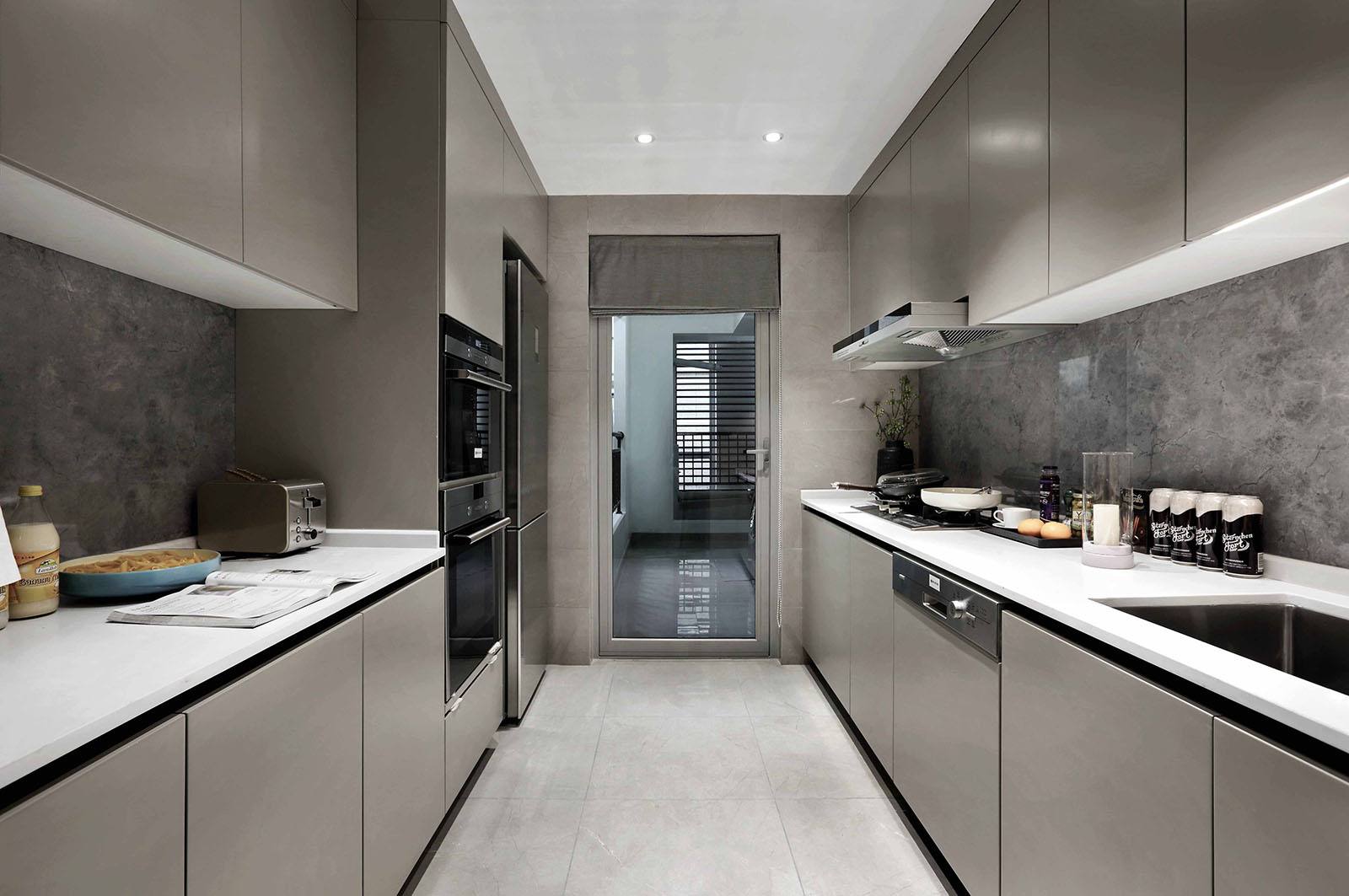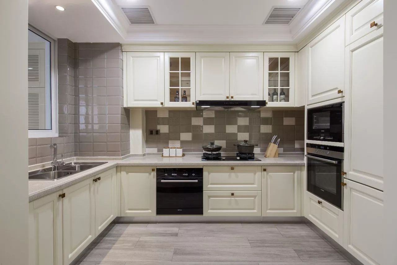 2、玻璃材质利用。采用玻璃,展示效果强,不会让人感到压抑。在小户型的设计过程中,一般使用的材料是玻璃,特别是吊柜中玻璃边框的运用,非常有现代感。选择视觉冲击感较强的金属材料和亲和力强的颜色。细心的人会发现,设计师较少设计颜色较暗的吊柜。整体厨房的色彩,应以单色调、浅色系为主,橱柜不宜使用黑色、深棕色等较暗的颜色,白色、浅灰色或明亮的奶黄色、浅蓝色等都是不错的选择。