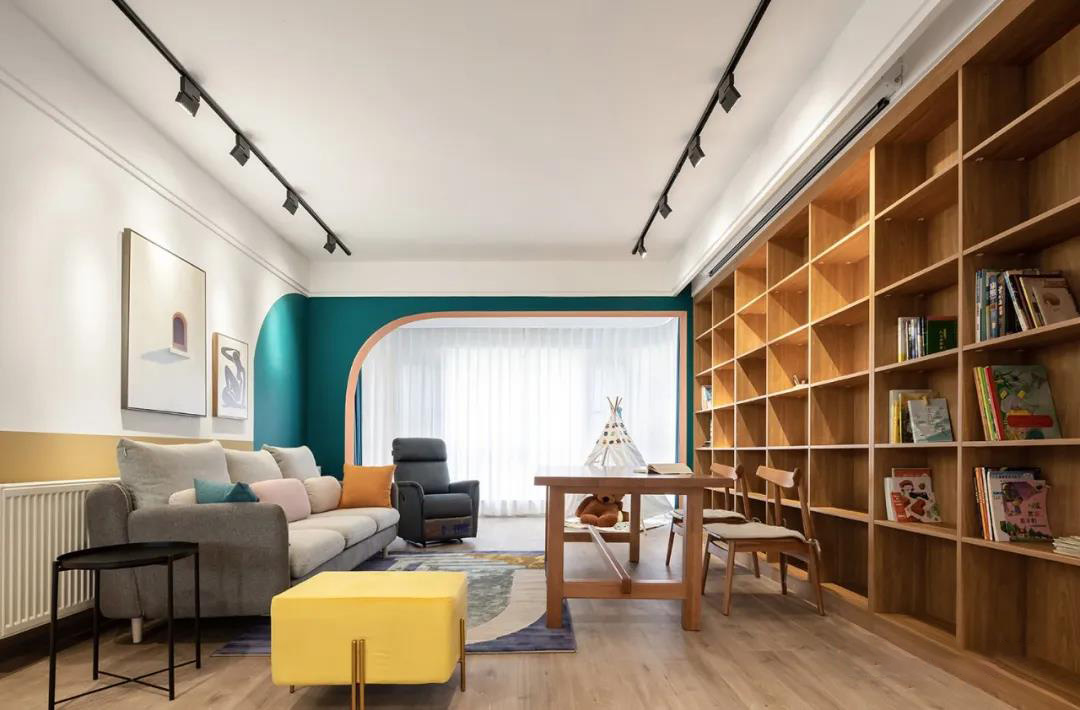 打破传统客厅布局,布置沙发与书桌椅,做了整面开放式书架,多种功能的变换增加人与人之间的交流。