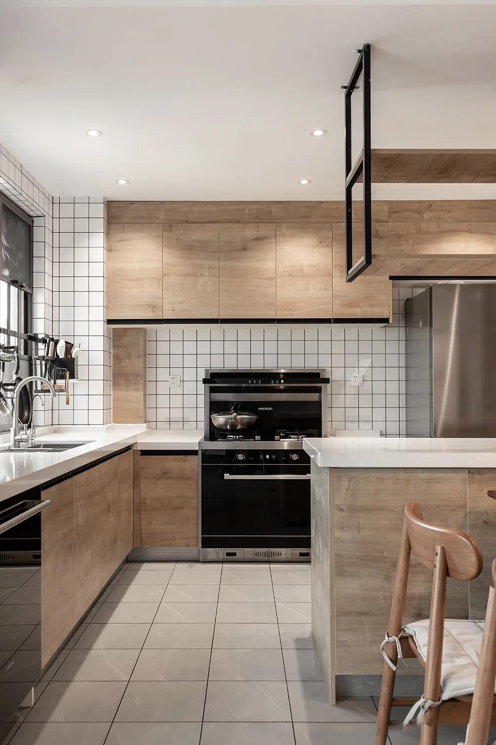 厨房,木色橱柜搭配小白砖墙面,台面做高低处理,设计工业风下挂式酒架,既是装饰也可收纳。