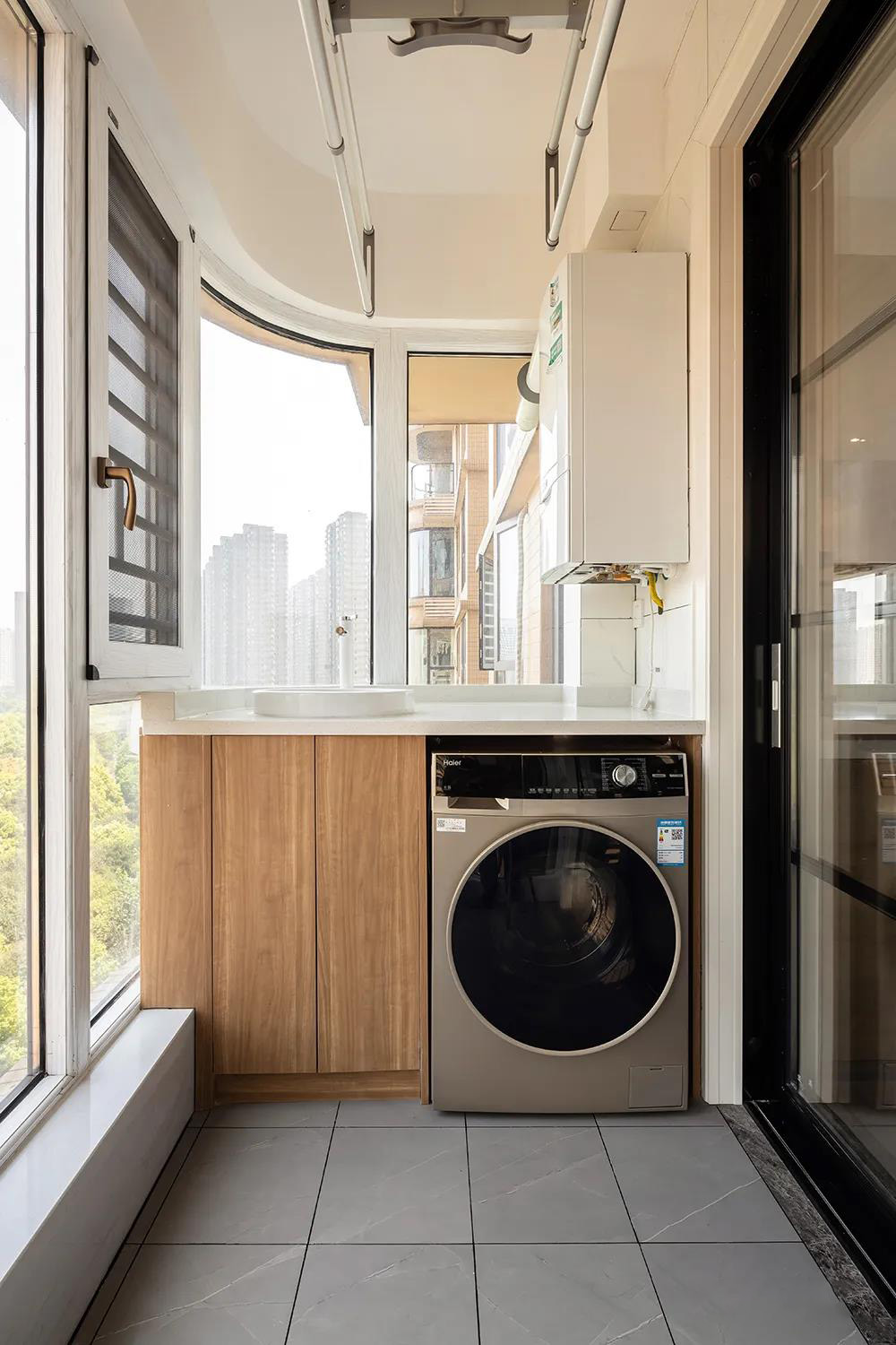 客卫干湿分离,双台盆设计提高生活效率,定制储物柜中部留空用于置物,上下柜体用于储备生活用品。
