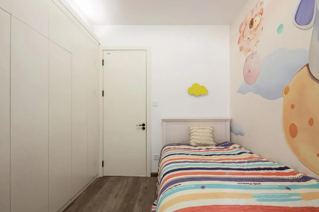 儿童房将小床靠墙摆放,留出足够的柜门开启空间,卡通床品与壁纸充满童趣。