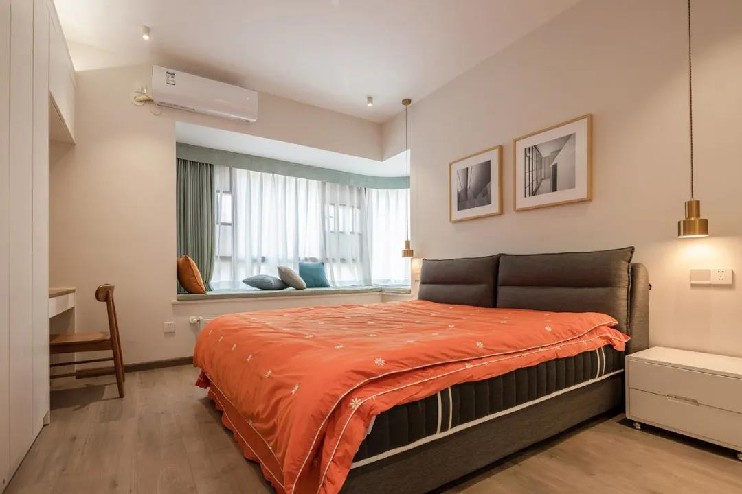 主卧布置简约温馨,床尾衣柜延伸出梳妆区,L型飘窗成为休闲一角。