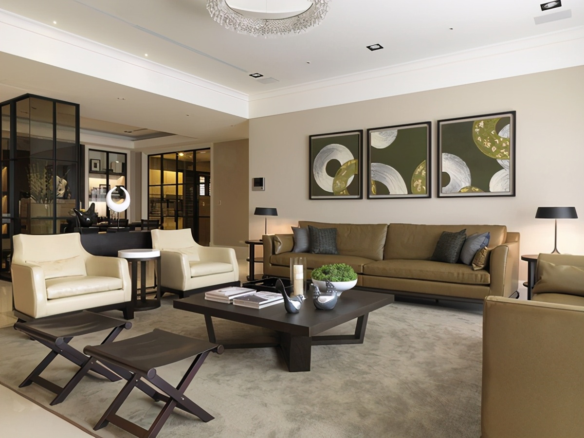 客厅中设计成了一个小型的会客厅,茶几、椅子都是实木的,非常的实用,纤维材质的沙发组合+单人沙发,让客厅的组合排列多样化,加上几幅抽象的装饰画,瞬间让客厅充满生活的气息。