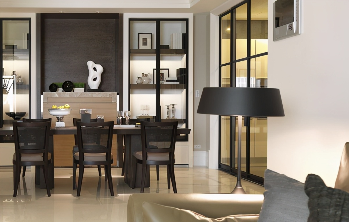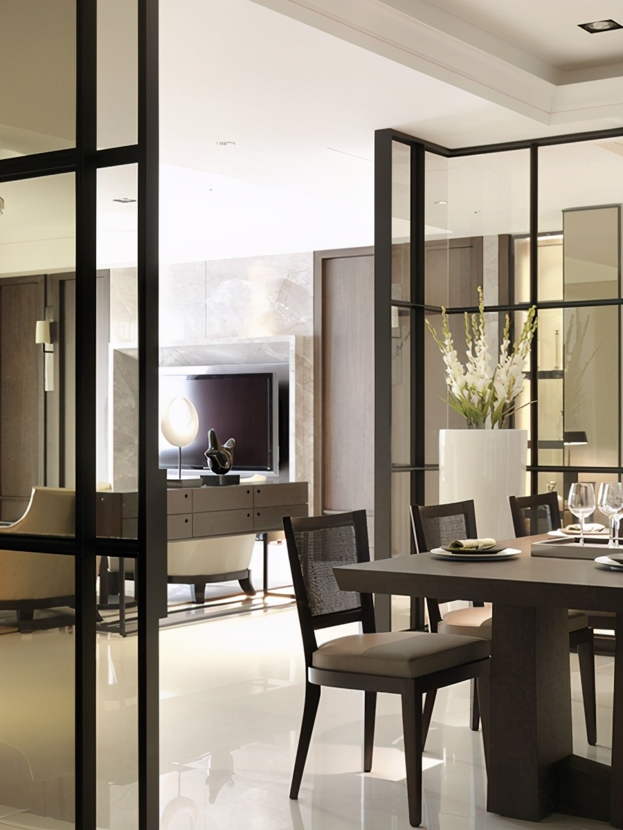 客厅与餐厅采用通透的玻璃推拉门作为隔断,在保证采光的同时还能与客厅互动,其乐融融的气氛蔓延在客厅与餐厅之间。