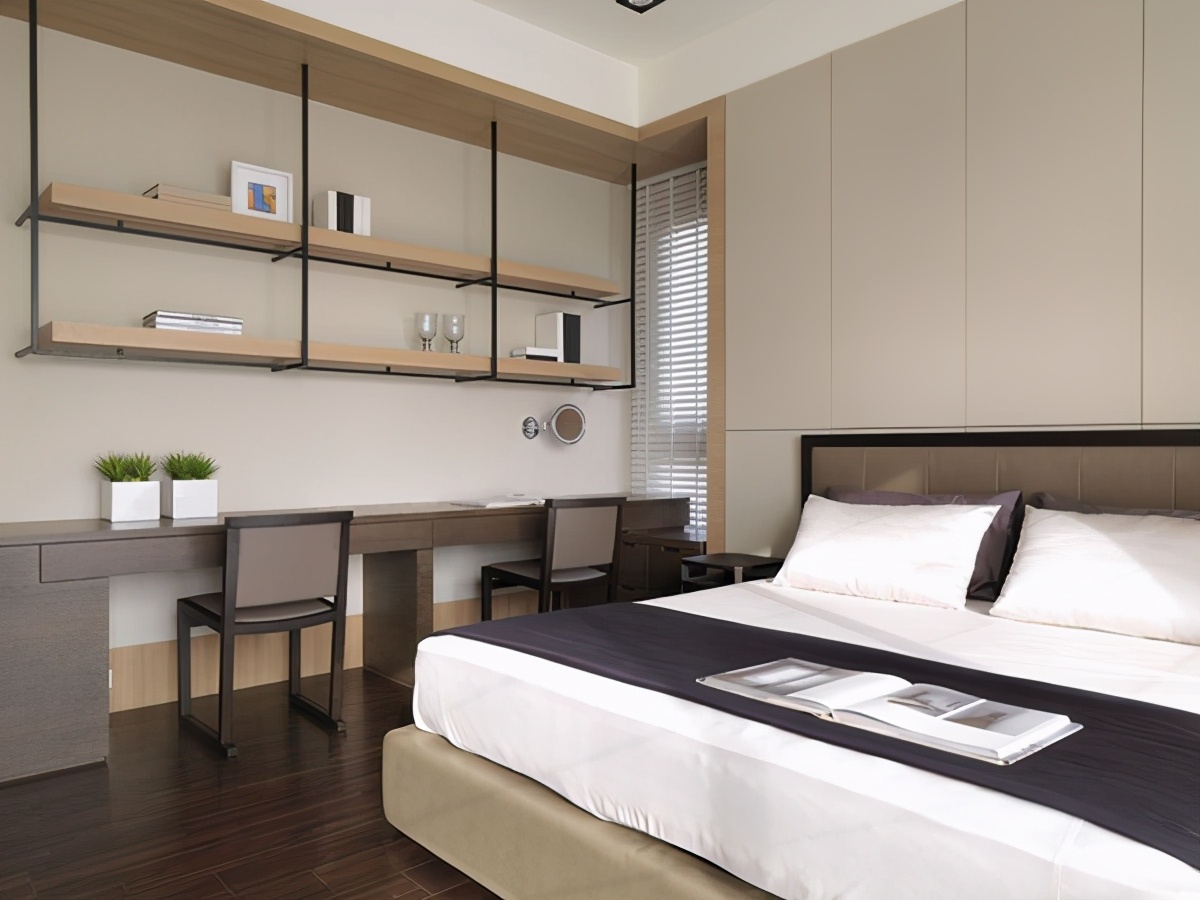 次卧空间有限,考虑到小孩的起居方便,沿墙设计榻榻米,让孩子起居都很方便。落地式的窗户,让房间的采光非常的充足,加上拉伸的百叶窗,简洁轻盈,也提高了使用的舒适感。