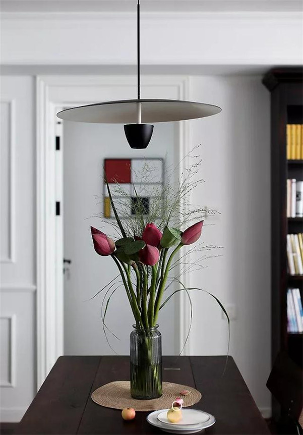 ▼客餐厅一体的设计,是近几年最流行的搭配设计。不论你家是大户型还是小户型,这种操作都可学习。深咖色的家具稳住了餐厅的整体气场,倚墙而立的简约置物架方便生活小物件的摆放与拿取,一盏独特的吊灯,看后让人不由得想深陷其中。