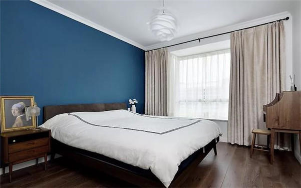 ▼卧室的蓝色背景墙十分醒目,沉稳的深色木质家具搭配,卧室的高贵气势油然而生。一盏洁白的玫瑰花吊顶,浪漫且优雅,边侧的复古梳妆台是每个女孩都想拥有高级“装备”。