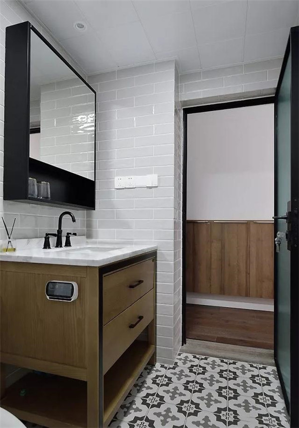 ▼卫生间沿用了厨房同款小白砖,进门处的台下盆洗手区,便于清洁。卫生间的功能区分工明确,储物拿取更方便。