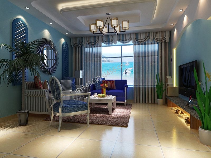 80平米地中海风格三居客厅吊顶灯装潢效果图