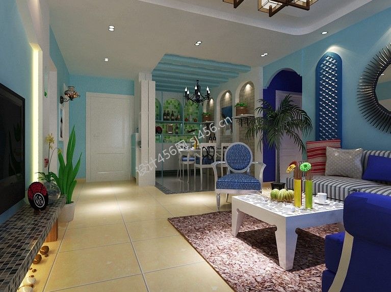 80平米地中海风格三居客厅沙发墙装潢效果图