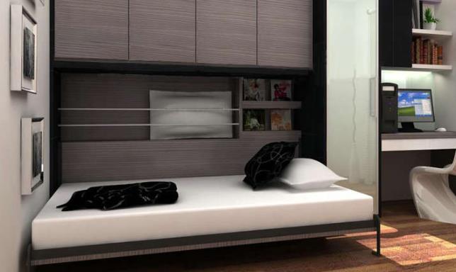 隐藏式折叠床是小户型设计中常用的一种床铺。它可以和衣柜搭配设计,闭合起来和衣柜一体,拉下就是一张床铺。除此之外,在卧室利用折叠沙发床也是一个选择,但沙发床的舒适感还是没有真正的床垫来的舒服。