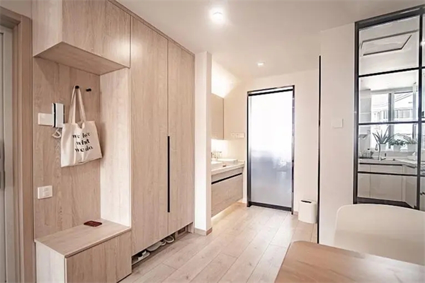 2、运用贴墙的优点,能够做一个顶天立地式的收纳柜,不喜欢这种收纳柜,墙上的空间还能够运用悬挂的方法,挂上衣物、雨伞、包包等,还能起到装修效果。