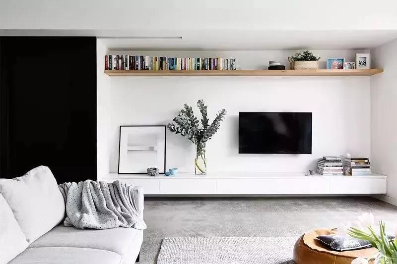 也有更追求简约的家庭,直接用搁板来充当电视柜。简简单单又大气。(就是什么都藏不了,不爱收纳的朋友慎选)