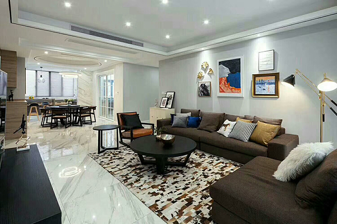 客厅与餐厅一体式,以吊灯来区分空间的不同,地面的灰白花纹瓷砖也非常的明亮洁净,落地灯把整个空间的衬托得舒适异常。