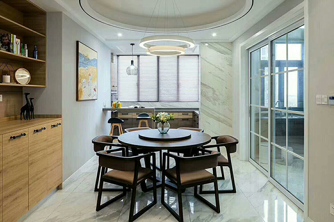 餐厅圆形的吊灯吊灯与圆形,让空间立体感更强,再配上百叶窗,看起来明亮舒适,半开放式的实木柜可作为装饰或者放置物品。