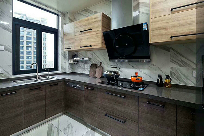 厨房与客厅一样用灰白色花纹的瓷砖来装饰,再配上实木橱柜看起来明亮且清爽。
