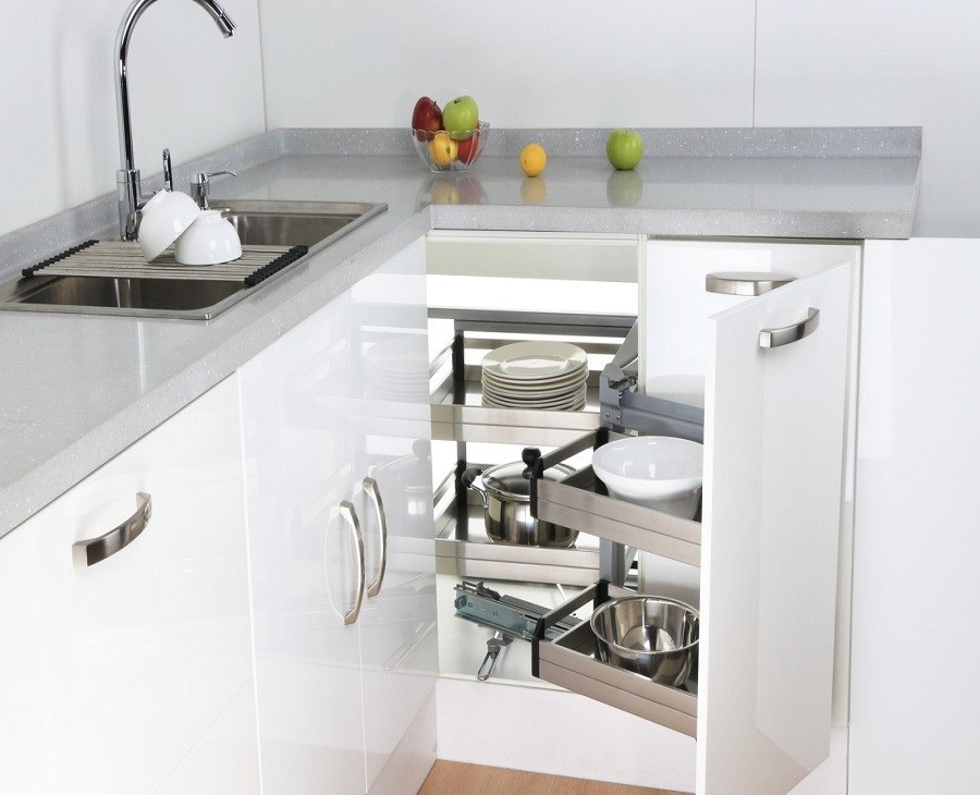 转角拉篮适合设计在拐角处,不占用空间,可以更加有序的放置餐具,让用户拿去更加方便。