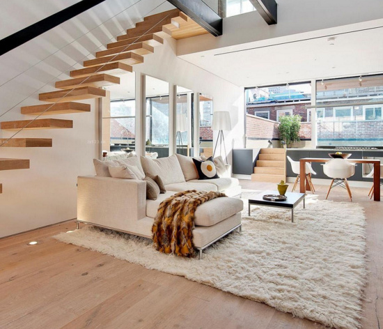 4. 跃层阁楼设计时其楼梯是非常关键的,因为这是连接上下两层的重要沟通纽带,所以其楼梯的设计一定要能满足平常家具搬运以及日常行走要求。而且要考虑到楼梯的承重能力,防火要求等,也就是说楼梯的选材要是非燃烧体。其楼梯结构布置、楼梯形式及细部构造处理都要非常认真,否则会影响到整个空间的协调性。还需要注意的就是楼梯扶手和栏杆一定要牢固,要保证其安全性。