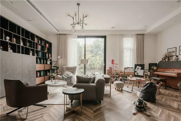 家里有小孩子的话客厅区域也可以腾空出来,布置出上地毯,平时可以坐在地上跟孩子一起玩亲子游戏互动,也可以坐在沙发上给孩子讲讲故事书,让整个客厅都以陪伴孩子为中心,不再是一家人围观电视机的场景。